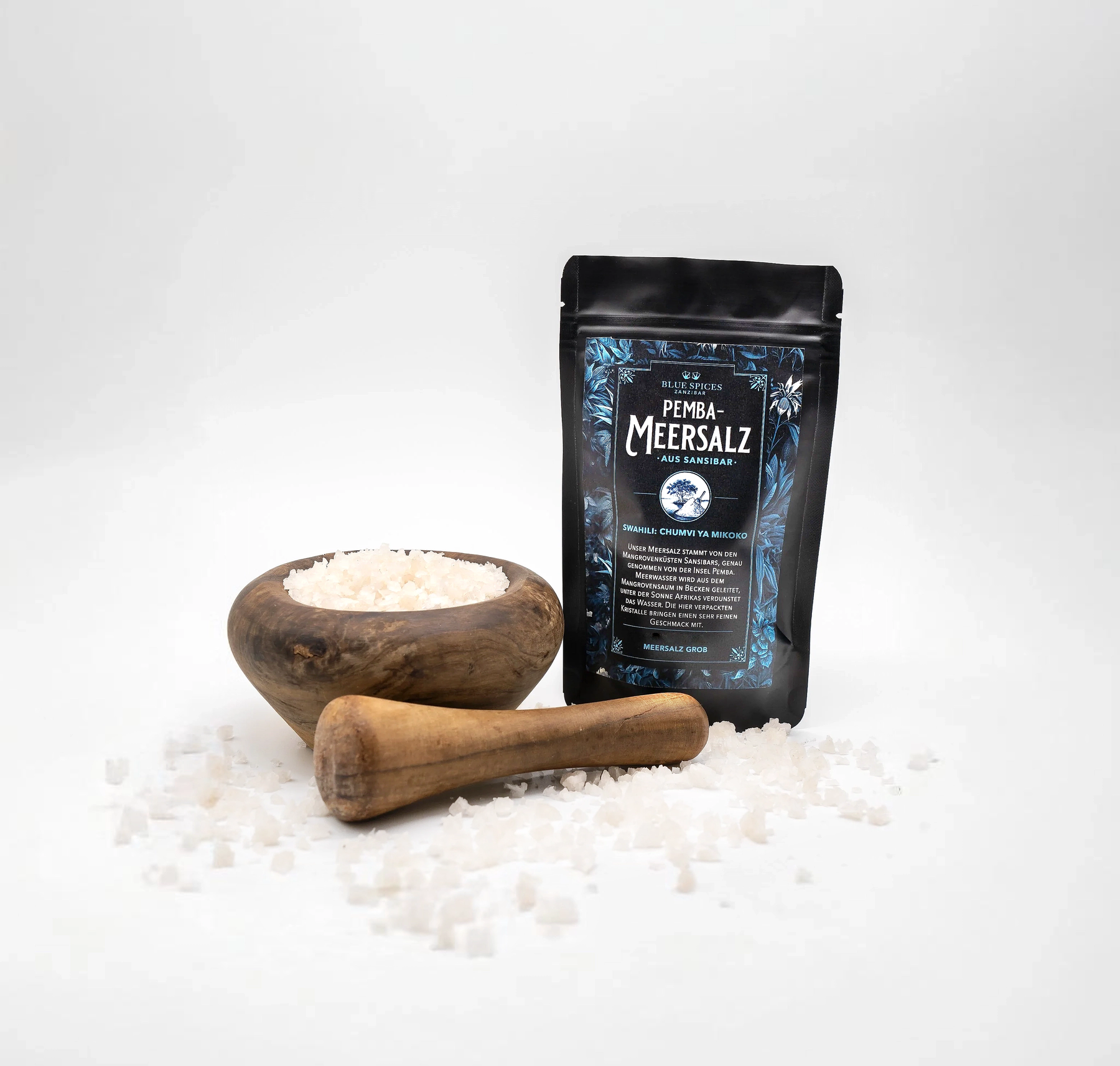 Swahili: Chumwi ya Mikoko Unser Meersalz stammt von den Mangrovenküsten Sansibars, genauer gesagt von der Insel Pemba. Meerwasser wird vom Mangrovenrand in Becken geleitet und verdunstet unter der afrikanischen Sonne. Die verpackten Kristalle haben ein sehr feines Aroma.